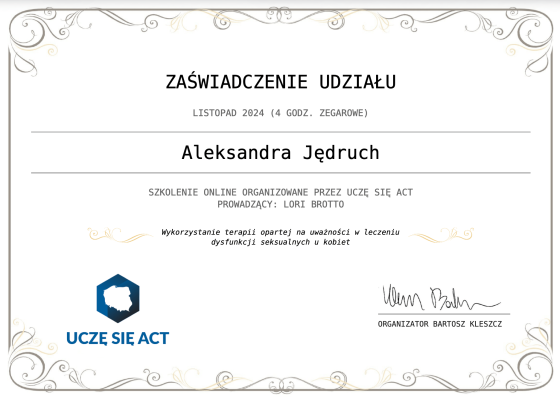 - Wykorzystanie terapii opartej na uważności w leczeniu dysfunkcji seksualnych u kobiet – 4h