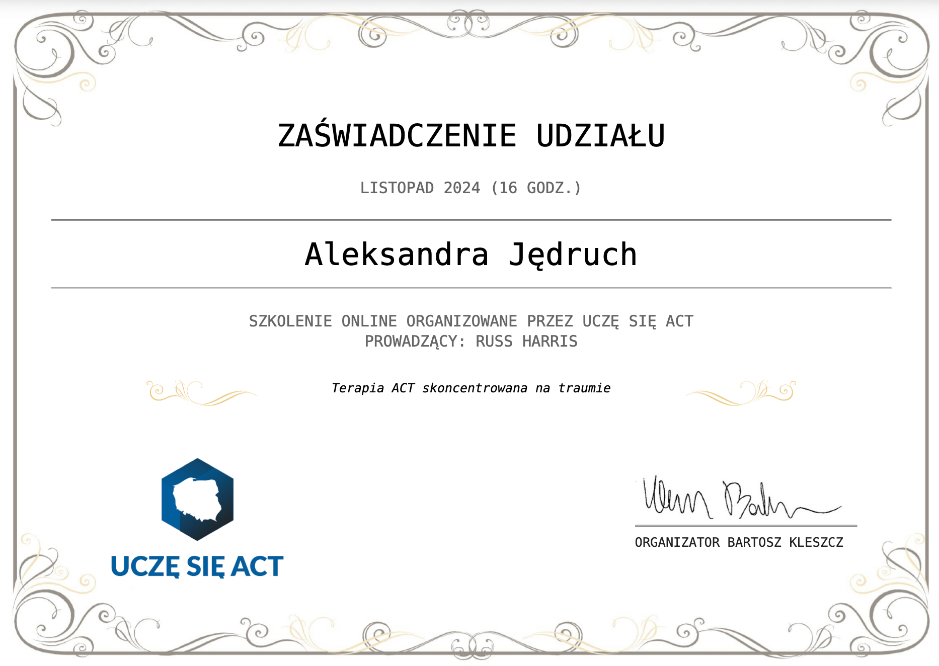 - Terapia ACT skoncentrowana na traumie – 16 h